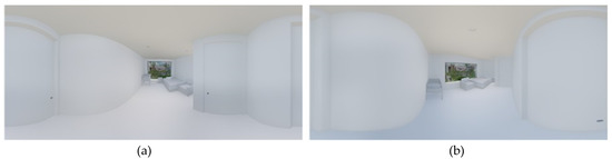 VR space 360° 3D image example. (a) It is an image with 2.3 m of ceiling height and 80% of window area ratio applied to the aspect ratio A type of space. (b) It is an image with 2.3 m of ceiling height and 60% of window area ratio applied to the aspect ratio of the space B type.