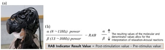 (a) Wearing experimental equipment. EEG equipment was first worn, and VR equipment was worn on top of it. (b) The ratio of alpha to beta waves (RAB) indicators and formula for deriving results. If the RAB indicator results presented in this paper are positive (+) above zero, it can be interpreted that the proportion of alpha waves to beta waves increased after stimulation than before and after stimulation, resulting in relaxation. A negative (−) value can be interpreted as a reduced proportion of alpha waves to beta waves, resulting in an arousal response.