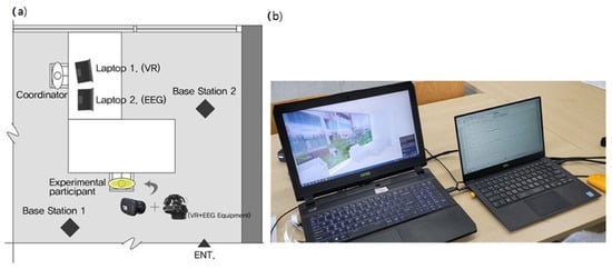 (a) Laboratory schematic diagram. The controller operated two laptops in front of the two pieces of equipment. The base station required for VR to operate is installed so that it faces diagonally around the experimental participants and synchronizes it. (b) EEG-VR adjustment laptops. The laptop on the left is for VR adjustment, and researchers can see where the experimental participants are looking in real-time by moving their eyes in the VR space. The laptop on the right sets the brain wave measurement time and data storage status for EEG adjustment, and can observe changes in brain waves in real-time.