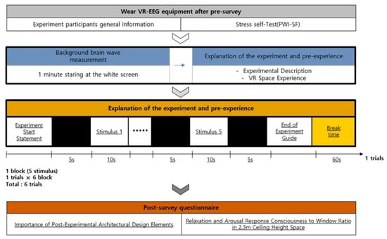 Participants were asked to minimize their body movement and keep silent for the duration of the experiment. Still, they were allowed to turn their head to left and right naturally while experiencing the VR space. The experiment was designed to naturally flow following the description displayed in the VR. The overall experimental process is shown in Figure 5.