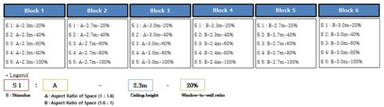 The 30 visual stimuli were grouped into six blocks, each of which included five stimuli combining the architectural elements, i.e., aspect ratios of space, ceiling heights, and window ratios (Figure 6). We set the duration of the exposure of the VR stimuli based on previous studies and the interview with the participants after the pilot experiment. The duration of the exposure of the EEG stimuli varies across authors. Yasuhisa et al. (2020) exposed each image stimulus for 6 seconds [67], whereas Wei-Yin et al. (2019) presented 60 photos at random for 20 seconds [68]. Agnieszka et al. (2018) presented 36 images at random for 10 seconds [41]. In this study, we interviewed the participants in the pilot experiment and found it took them 10 s to perceive a space without dozing off. Therefore, we chose to expose each stimulus for 10 s based on the interview results. Each block was run in the following order: The display of the introductory description—black screen (5 s)-stimulus 1 (10 s)-stimulus 2 (10 s)-stimulus 3 (10 s)-stimulus 4 (10 s)-stimulus 5 (10 s)-the display of the end-of-experiment statement—recess. Each block and the stimuli therein were arranged in random order. This process was repeated six times before the experiment ended. Each participant was exposed to the VR space for 9 min in total.