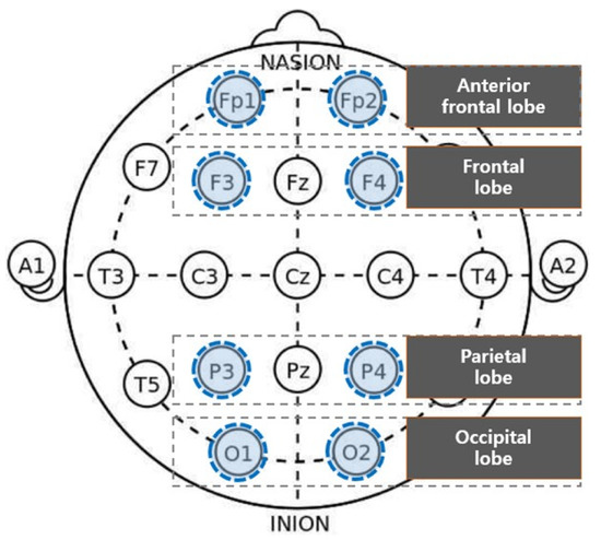 As shown below, 19 channels of EEG electrodes were attached in accordance with the international 10/20(10–20%) system (Fp1, Fp2, Fz, F3, F4, F7, F8, Cz, C3, C4, T3, T4, T5, T6, P3, P4, Pz, O1, and O2). The reference electrode was attached to the back of the right earlobe, while the ground electrode was attached to the back of the left earlobe. The EEG was measured with the monopolar derivation.