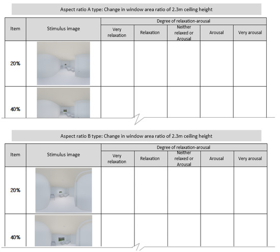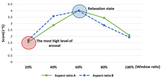 In this study, we examined the EEG-based relaxation-arousal responses to the window ratio, which is essential element involving the visual openness, visibility, view, and natural daylighting, among other design details of windows for a healing environment. We set up five types of window ratios by referring to Kim et al. [66], i.e., 20%, 40%, 60%, 80%, and 100%.