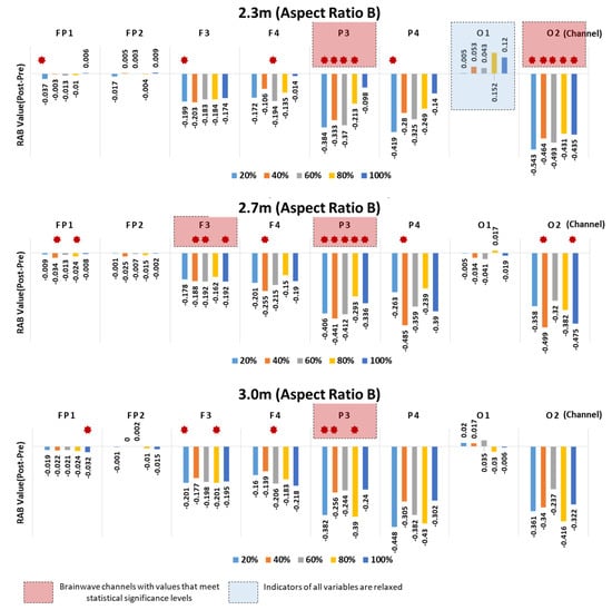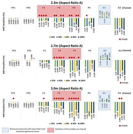 As a result, statistically significant differences were observed in the changes of the pre- and poststimulation EEG RAB indicator values, while the participants were experiencing the VR space where the architectural elements were varied. That is, we statistically verified the effects of the changes to architectural elements on users’ relaxation-arousal responses. Noteworthily, in all the RAB indicator values that showed significant differences, the poststimulation ratio of the alpha to beta waves decreased compared to the prestimulation ratio, which was indicative of the arousal response. However, the arousal levels varied across the architectural elements, which derived the elements that induced the less arousal response using this method.