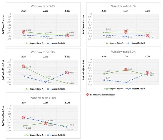 - Second, the combinations of ceiling height and window ratio that induced the lowest level of arousal reaction were 2.3 m and 60% for Type A (1:1.6) and 2.3 m and 100% for Type B (1.6:1), and accordingly, we recommend these combinations.