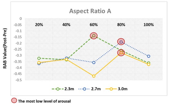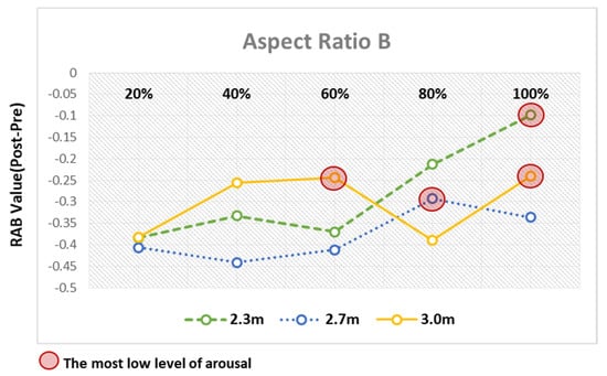 The EGG analysis showed that when the window ratios are 20 and 40%, the aspect ratios and ceiling height had no strong effect on users’ arousal level, while, when the ratios are 60, 80, and 100%, both variables had a strong effect on users’ arousal level, and that there were significant differences in the arousal level induced by Types A and B. These results may provide a cue for the practitioners to design more comfortable space based on the users’ physiologic reaction. The design standards recommended for practitioners when they design private rooms in postpartum care center are as follows: