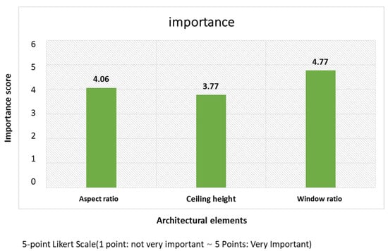 (iii) Posttest survey: Following the VR-EEG experiment, we surveyed the participants to compare the EEG response with the survey results about their consciousness. We asked the respondents to recall the space they had just experienced while filling in the questionnaire. The questionnaire comprised the items concerning the importance (1: not important at al~5: very important) of the architectural elements that influenced the relaxation-arousal responses following the VR experience and those concerning the consciousness of the relaxation and arousal in response to the images of the space they experienced (1: very arousing~5: very relaxing). Here, for the question items concerning the consciousness related to relaxation and arousal, we did not use the images of the entire experimental space. Instead, we used only 10 images of the environment whose ceiling height was 2.3 m and whose aspect and window ratios were varied, since the participants had difficulties in accurately perceiving and discriminating among the three different ceiling heights in the pilot experiment and interview.