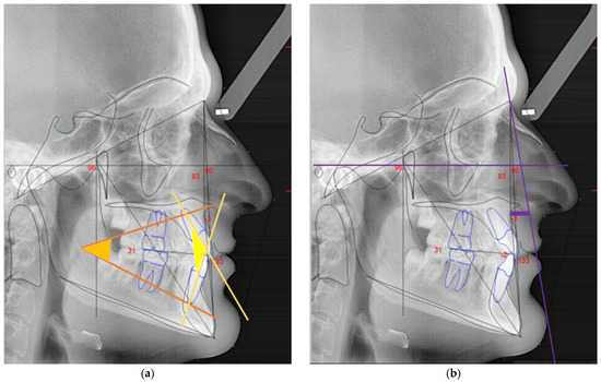 Figure 2. Rickett’s cephalometric analysis with specific parameters analyzed: (a) lower facial angle (orange) and interincisal angle (yellow); (b) facial convexity (purple). - Lower facial angle: angle between the planes formed by the anterior nasal spine to Xi point (ANS-Xi) and the Xi point to protuberance menti (Xi-PM) (in orange, Figure 2a);