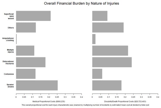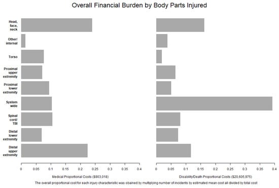 We also calculated the proportion of costs attributable to specific types of medical-only claims as a measure of overall burden. The attributable costs of death/disability and medical-only claims were calculated by multiplying the model-based means by the number of claims for each injury characteristic. We then determined the proportion of total costs attributed by each injury characteristic by dividing total costs by the overall cost of the claim types, disability/death, and medical-only claims. We then constructed a bar graph to illustrate the proportion of costs attributable to the key injury characteristics.
