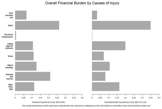 The cause of injury categories of (i) falling or flying objects and collisions, and (ii) slips, trips, and falls accounted for a substantial proportion of severe injury and total workers’ compensation costs. Overall, falling or flying objects and collisions were the most expensive cause of death/disability claims, on average costing about USD 125,000 and representing one in ten claims. Slips, trips, and falls, on the other hand, were twice as frequent, accounting for one in five injuries, but were less costly per claim with an average disability/death claims cost of about USD 40,000. Similar to our study, slips, trips, and falls have been identified as a leading cause of agricultural injury resulting in a WC claim in the U.S. and international settings [,,,]. However, altogether, injuries from these two causes (i.e., slips, trips, and falls and falling or flying objects and collisions) represented about a quarter of the total costs of death/disability claims in our study.