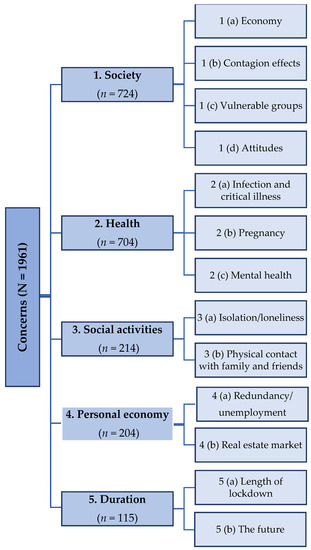 Comments were made by 1491 informants and they presented 1961 concerns in the open-ended question “Do you have other concerns related to the pandemic?” Analysis of sociodemographic differences between those who commented on concerns or not revealed that there were more respondents with higher education (86% vs. 83%, respectively, p = 0.022) commenting. None of the remaining variables were significantly different between the groups, but more women (34% vs. 30%, p = 0.050) commented on concerns.