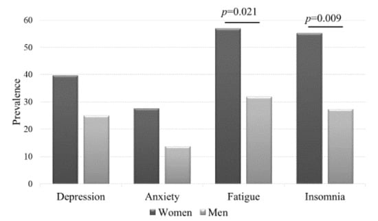 The prevalence of symptoms of depression, anxiety, fatigue, and insomnia in different gender groups.
