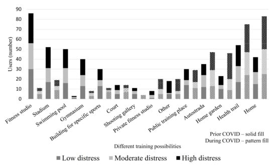 The most disturbing issue for athletes was the closing of training centers (57.8%), and cancellation of the competitions (50%); with athletes identifying the European Championships (36.3%) and Olympic Games (19.6%). Loss of possibilities of training (n = 43.1%) and unknown future situation (n = 17.6%) were also worrisome for study participants. However, 34.3% continued training on the same level; 43.1% tried to maintain their basic fitness level and waited for the clarification of the situation, and only five (4.9%) athletes discontinued training. The training possibilities prior and during the COVID-19 situation are presented in Figure 2. Although training opportunities differed prior to and during the pandemic, there were no differences in proportions of EST-Q2 distress groups across training opportunities. Half of the participants considered new alternative training conditions as interesting/challenging (52%), but one-fifth (21.6%) evaluated the new conditions as tiresome. Among those who considered the new situation challenging (as an opportunity to train and prepare in unique ways), were statistically less persons with depression (p = 0.034) compared with others. Athletes who considered the situation tiresome had more insomnia in comparison with others (59.1% vs. 31.3%; p = 0.032). An equal number of athletes (14) perceived new training conditions as inspiring or as demotivating.