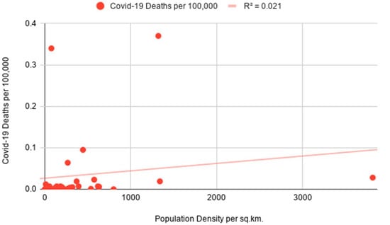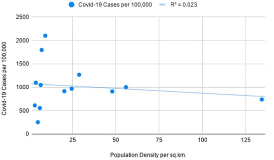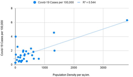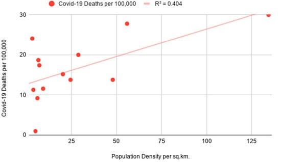 Despite the extensive empirical evidence indicating the significance of population density as a determinant of Covid-19 spread, the findings vary from country to country and from region to region. The pandemic lasted for less than 12 months by the time of this study but a comprehensive body of knowledge started to form with regard to the interrelation of socio-demographic factors and lockdown policies []. From this perspective, countries that implemented strict lockdown policies were expected to report lower infection rates and mortality rates in highly populated regions. As strict lockdown policies are especially effective in densely populated areas with expansive state control over the population, non-democratic nations showed the weakest causal relationships between the parameters investigates within the scope of the present research []. The described assumption does not deviate from the aforementioned claims because population density can still be used as a predicting factor during the early stages of an infectious outbreak as had been outlined in past studies. Moreover, countries with comparatively weak state control and disobedience among citizenry are those associated with the strongest positive correlation between population density and Covid-19 spread []. The strengths of causal relationships further vary across different cities and townships in the same country with the majority of reports confirming that low population density is tied to low infection rates []. There is no conclusive data on the relationship between population density and Covid-19 morbidity in sparsely populated regions.