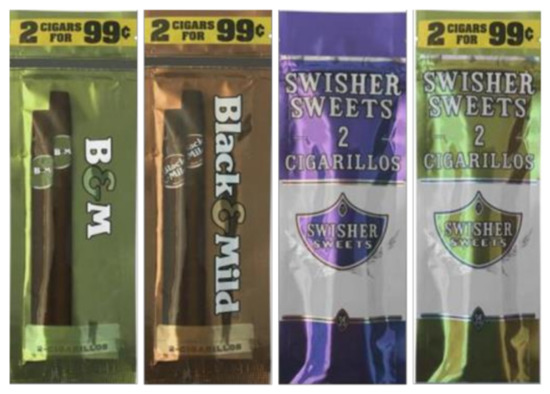 - Evans, A.T.; Wilhelm, J.; Abudayyeh, H.; Perreras, L.; Cohn, A.M. Impact of Package Descriptors on Young Adults’ Perceptions of Cigarillos. Tob. Regul. Sci. 2020, 6, 118–135. [Google Scholar] [CrossRef]