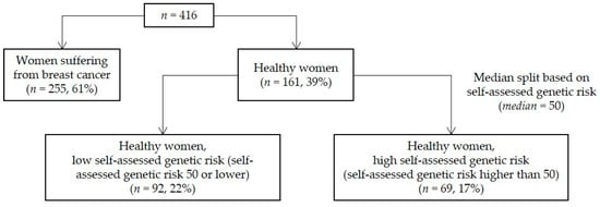 Breast cancer was diagnosed previously in 255 women (61%), the remaining 161 women are referred to as healthy women (39%). None of the investigated women was suffering from ovarian cancer. The healthy respondents were further divided based on their self-assessed genetic risk, which resulted in three groups in total: (1) women suffering from breast cancer (n = 255, 61%), (2) healthy women with low self-assessed genetic risk (n = 92, 22%), and (3) healthy women with high self-assessed genetic risk (n = 69, 17%). Figure 1 gives an overview of the sample and the three groups.