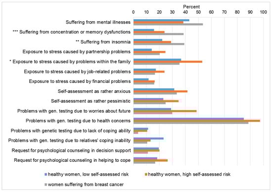 Psychological distress is a broad term that commonly includes anxiety, stress, worry, panic, and fears []. In this study, we asked for specific fears, worries and stressors that may arise in women at high risk of hereditary breast and ovarian cancer before undergoing genetic counseling. Do women show an increased level of psychological distress before undergoing genetic counseling to investigate their risk for HBOC? Within this group of women: Do women with breast cancer have a higher level of psychological distress than healthy women? This leads to the next question: Does a high versus a low self-assessed genetic risk for HBOC in healthy women have an effect on the (1) presence of mental illnesses, concentration or sleep disturbances, (2) stress exposure, (3) fears to cope with the results of the genetic testing and challenges to communicate the results within their families due to relatives’ lack of coping abilities, and (4) request for psychological counseling. Further, we aimed to explore differences between women with and without children regarding different forms of problems with genetic testing regarding HBOC.