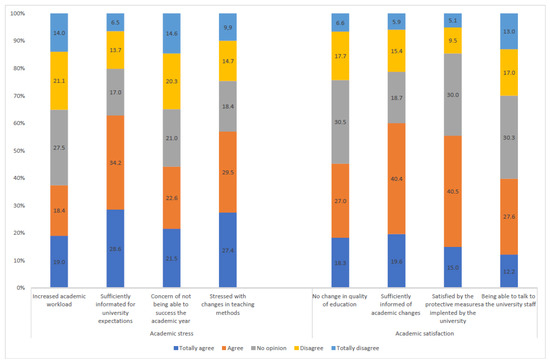 Academic environment was assessed using a Likert scale (1 totally agree to 5 totally disagree) about: Academic stress (increased academic workload, information on university expectations, concern of not being able to validate the academic year, stress with changes in teaching methods) and academic satisfaction (no change in quality of education, sufficiently informed of academic changes, satisfied by the protective measures implemented by the university and being able to talk to the university staff).