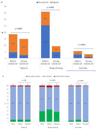 Changes in tobacco smoking, binge drinking and cannabis use were categorized as favorable if, between the periods before and during COVID-19, the frequency changed from occasional or regular to never, or from regular to occasional; as unfavorable if, between the periods before and during COVID-19, the frequency changed from never or occasional to regular, or from never to occasional); and as no change if, between the periods before and during COVID-19, the frequency did not change.