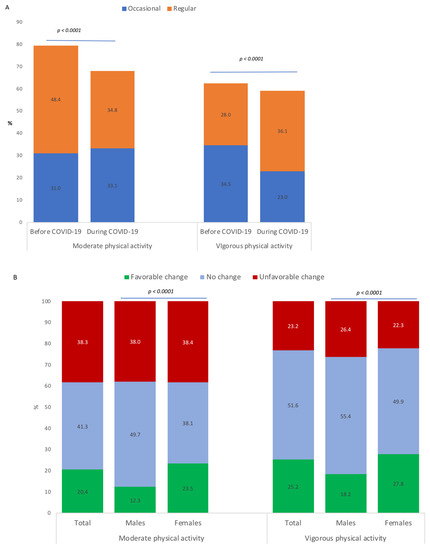Results in Figure 3 (panel A) show a significant decrease in the prevalences of moderate physical activity (79.4 to 67.9%; p < 0.001) and vigorous physical activity (62.5% to 59.1%; p < 0.001) between the periods before and during COVID-19. These decreases represented favorable changes in 20.4% of students for moderate physical activity and in 25.2% of students for vigorous physical activity; and unfavorable changes in 38.3% of students for moderate physical activity and in 23.2% of students for vigorous physical activity (Figure 3, panel B). Favorable changes were more represented in female students than male students (p < 0.001).