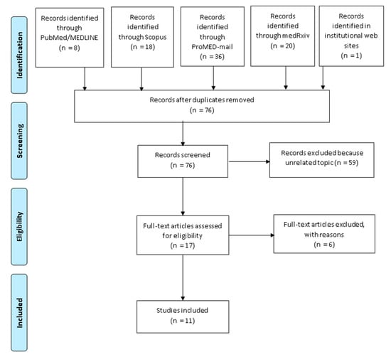 A total of 38 articles were retrieved, of which 8 in PubMed/MEDLINE, 18 in Scopus, and 20 preprints from the platform medRxiv; however, seven articles were duplicates and were immediately removed. In ProMed-mail, six updates including a total of 36 posts were retrieved, of which only two met inclusion criteria [,]. Scanning the webpages of Health Authorities, only one relevant report from the ECDC was detected []. Hence, a total of 76 articles and posts were screened, and based on title and abstract, a total of 59 were excluded because considered irrelevant. A total of 17 articles were assessed in full, and 6 were excluded due to the following reasons: Four articles reported on cases which originated in ski areas but did not add any further information or details [,,,]. Another article discussed an infectious disease outbreak management tool for endurance mass-participation sporting events []. Finally, there was an article considering the consequences of confinement among athletes []. At the end of the selection process, a total of 11 articles were included in the review [,,,,,,,]. Figure 1 illustrates the selection process.