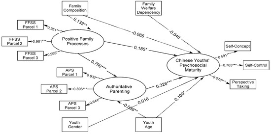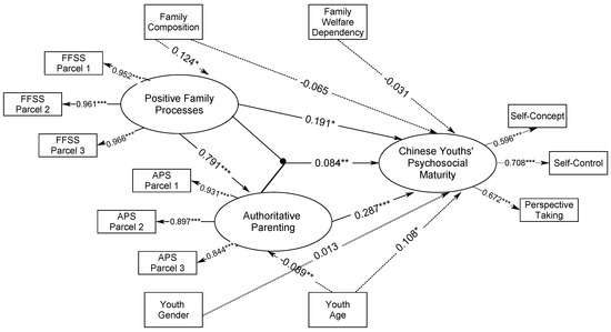 Structural Relationships of Positive Family Processes and Authoritative Parenting and Their Latent Interaction in Prediction of Psychosocial Maturity of Chinese Youths (Model 2). Note. AIC = 9490.267, and BICc = 9531.053. * p < 0.05; ** p < 0.01; *** p < 0.001.