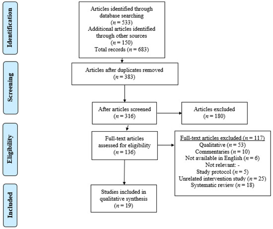 The database searches yielded 683 titles, of which 19 studies were included after the full-text analysis. If any of the articles reported more than one direct outcome regarding the relationship between the patient’s decision and quality health outcome, each result was included separately. Figure 1 provides an overview of the selection process.