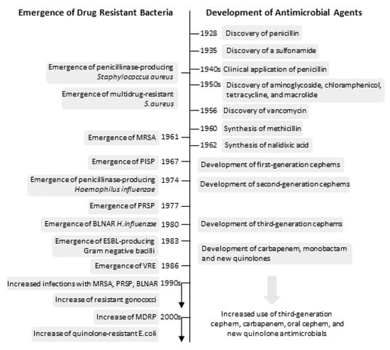 Trend of development of antimicrobial agents and emergence of drug-resistant bacteria []. MRSA, Methicillin-resistant Staphylococcus aureus; PISP, penicillin-intermediate-resistant S. pneumoniae; PRSP, penicillin-resistant S. pneumoniae; VRE, vancomycin-resistant enterococci; BLNAR, β-lactamase-negative ampicillin-resistant; MDRP, Multidrug-Resistant Pseudomonas Aeruginosa. Figure adapted from [].
