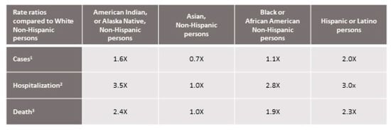 Risk for COVID-19 infection, hospitalization, and death by race/ethnicity [].1 Data Source: Data reported by state and territorial jurisdictions (accessed 11 April 2021). Numbers are ratios of age-adjusted rates standardized to the 2019 U.S. intercensal population estimate. Calculations used only the 61% of case reports that have race and ethnicity data available; this can result in inaccurate estimates of the relative risk among groups. 2 Data Source: COVID-NET (https://www.cdc.gov/coronavirus/2019-ncov/covid-data/covid-net/purpose-methods.html, accessed 1 March 2020, through 3 April 2021). Numbers are ratios of age-adjusted rates standardized to the 2019 US standard COVID-NET catchment population. 3 Data Source: National Center for Health Statistics (NCHS) provisional death counts (https://data.cdc.gov/NCHS/Provisional-DeathCounts-for-Coronavirus-Disease-C/pj7m-y5uh, data through 3 April 2021). Numbers are ratios of age-adjusted rates standardized to the 2019 US intercensal population estimate. Reproduced with permission from the U.S. Center for Disease Control (accessed 18 April 2021) [].