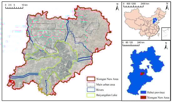 Location of the study area. The main urban area represents the area of the Xiong’an New Area that is planned for future urban development, where a large number of urban water systems and wetlands will be built.