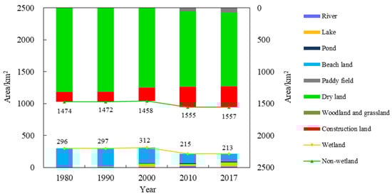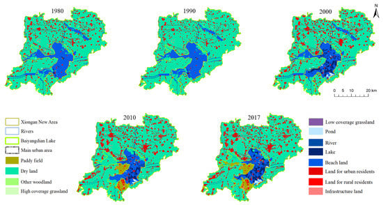 Land use data of the Xiong’an New Area for 1980, 1990, 2000, 2010, and 2017 were used for the landscape types, and the wetland landscape and non-wetland landscape types were divided into major and minor types (Table 1). The wetlands types were divided according to the Convention on Wetlands of International Importance Especially as Waterfowl Habitat (http://portal.unesco.org/en/ev.phpURL_ID=15398&URL_DO_TOPI-C&URL_SECTION=201.html (accessed on 6 October 2020)), which includes four types of land uses: rivers, lakes, ponds, and beach land. Paddy fields were primarily formed by artificial means during the late 1990s, and were treated as cultivated land resources.