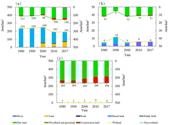 Changes in the area of the different landscape types in the Xiong’an New Area from 1980 to 2017. (a) Baiyangdian Lake, (b) rivers, and (c) main urban area.
