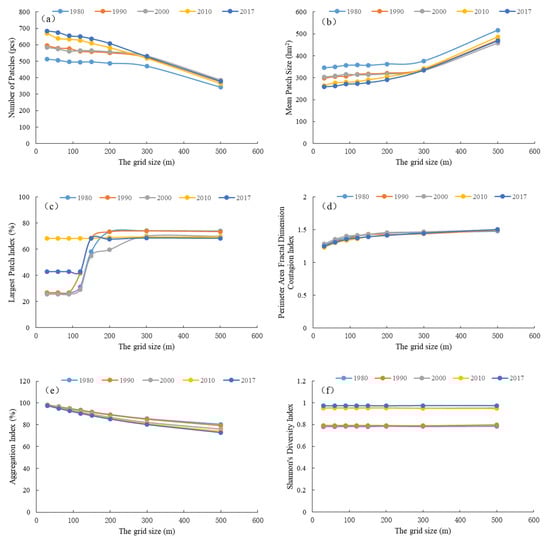 A landscape pattern analysis has obvious scale effects that are generally expressed in terms of the spatial amplitude and spatial granularity. The spatial granularity effect is mainly due to the fact that in gridded maps, the edges of the tiles are always larger than the actual edges, and the shape of the edges will also be different. Therefore, the grid version will produce errors when calculating the edge parameters. This error depends on the resolution of the grid. Hence, the changes in the landscape pattern index under different granularity conditions need to be analyzed to determine the optimal granularity interval for analysis and select the best granularity for further analysis. The following six landscape-level indexes were used to select the optimal granularity of the landscape pattern index calculation from the influence of the scale on its own value and the influence on the change trend of the multi-year series.