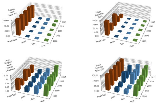 The index analysis of the landscape pattern at the class scale was conducted for four wetland types: beach land, pond, lake, and river. The result is shown in Figure 6. The LPI is a simple method used to describe the degree of landscape dominance. After a comparison, it was found that the LPI of beach land significantly exceeded the other types, indicating that beach land was the largest wetland-dominant landscape type in the Xiong’an New Area. However, the landscape dominance of beach land showed a slight downward trend, and the landscape dominance of other wetland types also slightly increased. The MPS of the beach land was the largest among the wetland landscape types, but in recent years, it has decreased from 35.61 km2 in 1980 to 8.82 km2 in 2017. This result indicates that the beach land patches tended to be scattered. The PAFRAC of each wetland type was in the range of 1.00–1.20, with little change. The shape and complexity of the landscape patches were similar. Among them, the shape of the ponds was the least complex, and the shape of the rivers was the most complex. Prior to 2000, the combination of ponds and lakes was relatively small, indicating a greater degree of fragmentation. After 2000, the combination of ponds and lakes increased, and the degree of fragmentation decreased. When the plaque fragmentation of the ponds and lakes decreased, it indicated that there were fewer patches in small areas, but increased patches in large areas. In addition, the plaque connectivity was enhanced, so the fluidity of material, energy, and information was enhanced. This had a positive effect on the growth and reproduction of animals and plants living in ponds and lakes. This was primarily due to the strengthening of water replenishment for the ecosystem during the later period, and also demonstrated the benefits of water replenishment for the ecosystem.
