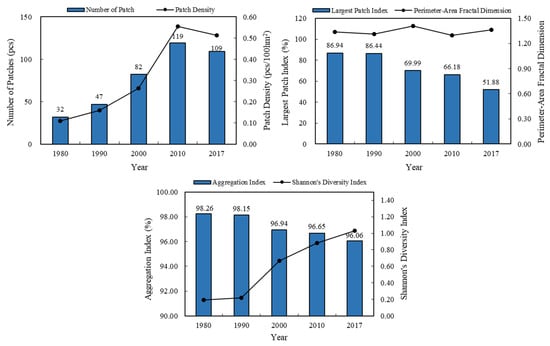 The greater the number of patches and the greater the patch density, the higher the fragmentation of the landscape. Figure 7 shows that during 1980–2017, the number of wetland patches and the patch density showed a gradual increase. Compared with 1980, the number of patches increased from 32 to 109 in 2017 and the increase rate reached 20 per 10 years. The patch density rose from 0.11 to 0.51, and the increase rate reached 0.1 per 10 years. The increase in the number of patches and patch density indicated that the fragmentation of the wetland landscapes is increased. However, it can also be noted that from 2010–2017, both the number of patches and patch density have decreased, primarily due to the implementation and protection of ecological environment protection policies. The LPI reached a maximum value of 86.94 in 1980 and then began to decline, indicating that the landscape types began to become more uniform. The PAFRAC did not change much, fluctuating near 1.30, indicating that the patch shape was not too complicated. The degree of patch aggregation showed a decreasing trend from 1980 to 2017, indicating that the connectivity of similar landscapes had gradually decreased. The SHDI showed an increasing trend, indicating that the proportion of various landscape types had been balanced and landscape heterogeneity increased. Because differences in the landscape classification system will cause differences in the resulting landscape pattern index, the above analysis results are only applicable to the wetland landscape classification system used in this study.