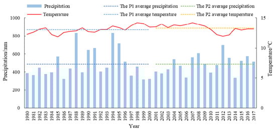 Changes in the precipitation and annual mean temperature in the Xiong’an New Area from 1980 to 2017. The data source: http://data.cma.cn/ (accessed on 10 October 2020).