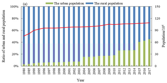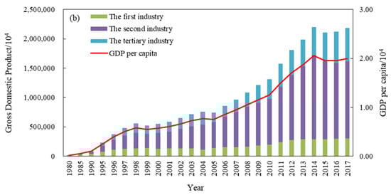 Changes in the economic and social factors in the Xiong’an New Area from 1980 to 2017. (a) Population and (b) economy. The data source: Baoding City Economic Statistics Yearbook (https://data.cnki.net/area/Yearbook/Single/N2017120334?z=D03 (accessed on 20 November 2020)).