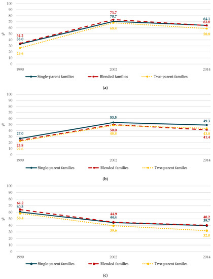 Changes in prevalence of food consumption according to the family structure between 1990 and 2014 (HBSC, Belgium, 1990–2002–2014): (a) non-daily fruit; (b) non-daily vegetable; (c) daily sugar-sweetened beverage.