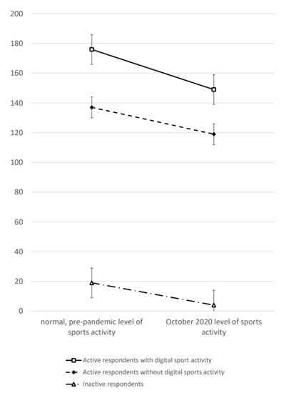 Comparisons of responses with reference to “normal” (pre-pandemic) activity levels and with reference to October 2020 (during the pandemic) reveal a decline in all three groups (Figure 1). Hence, sport and exercise activities were decreasing during the COVID-19 pandemic. This difference amounts to −27 min/week among active respondents with an involvement in digital sports activities, −19 min/week among active respondents without involvement in digital sports activities, and −15 min/week among inactive respondents. There are no statistically significant differences in these changes between the three groups, i.e., the time–group-interaction is insignificant (F2,1479 = 0.7; p = 0.504). Hence, an involvement or intensification of digital sports activities cannot protect against the general decrease of sports activity during the pandemic.