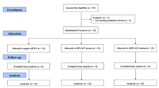 All assessments were conducted in an exercise performance laboratory at the University of Taipei. The participants first visited the laboratory for a familiarisation protocol. During the first visit, participants completed initial anthropometric data and practiced the testing protocol. The second, third, and fourth visits were trials of paper-off, 50%KTmax, and 100%KTmax conditions. The experimental conditions were randomised in the sequence order via Research Randomizer (https://www.randomizer.org/, accessed on 12 April 2021) [] with at least a 2-day interval between consecutive visits.
