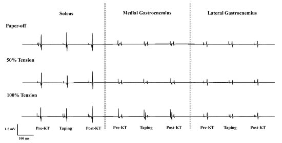 For the SOL muscle, a significant interaction between stretch tension and time was observed in the Mmax (F2,22 = 3.70; p = 0.011). Post hoc analysis revealed that larger Mmax was only found in 50%KTmax than that in paper-off in the pre-taping condition (paper-off = 2.80 ± 0.45 mV vs. 50%KTmax = 3.05 ± 0.49 mV; p = 0.038). Meanwhile, the MG demonstrated no statistical differences of the Hmax, Mmax, and Hmax/Mmax in all comparisons. For the LG muscle, a significant interaction was identified (F2,22 = 2.97; p = 0.030) for the Hmax. Post hoc analysis revealed that a larger Hmax was found in the pre-taping condition than that of the post-taping condition in the paper-off stretch tension (pre-taping = 0.75 ± 0.39 mV vs. post-taping = 0.69 ± 0.37 mV; p = 0.002) (Table 3). Figure 2 shows a raw EMG of H-reflex responses recorded in the SOL, MG, and LG in all testing conditions from one representative.