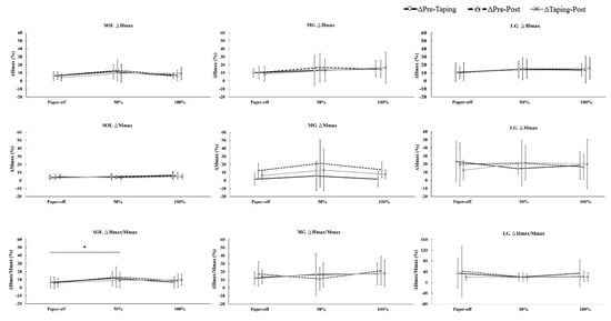 In the SOL muscle, a significant main effect for stretch tension was observed in the ΔHmax/Mmax parameter (F2,22 = 4.94; p = 0.035; η2 = 0.31). The post hoc analysis revealed statistical differences of pre-and-post difference between paper-off and 50%KTmax (paper-off = 6.68 ± 7.17% vs. 50%KTmax = 13.99 ± 13.11%; p = 0.046). In contrast, no significant difference of interaction and main effects were found in the MG and LG muscles (Figure 3).