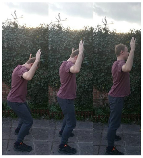 Figure 1 depicts the “spinal wave”, which is a gentle, rhythmic movement that initiates in the coccyx (or “tailbone” as it is referred to in class) and moves up the sacrum, lumbar and other regions of the spine until it reaches the occipital bone at the base of the skull. Some students might also envisage being raised at the crown point at the top of the skull “by a golden thread”, or being pulled up by a hook on the occipital bone at the back of the skull. In a typical evening class, David works in front of his 12–15 Taijiquan students lined up in two rows who are working in unison from a seemingly hunched, lifeless position, as in a puppet without a puppeteer pulling on the strings. Once their body is fully erect by stretching their spine upwards from the coccyx to the skull, they slump back down by folding the head forwards and sinking the tailbone down to bend the knees slightly. This initiates the process once again. Students then repeat the action dozens of times, while David adds variety by asking them to raise their hands above their heads while completing the motion. In Figure 1, George has deliberately selected this version of the exercise to emphasize the elongation of the spine from the profile position in three snapshots. On some occasions, student perform the exercise at a 45-degree angle. One might hear clicks in between the vertebra as they start to open. Indeed, David often shares a sense of wonder about this process, with comments such as: “Open up the space between the vertebrae”, reiterating the fact that “it’s so important to create space between the vertebrae”. Indeed, in one online class, David stressed that “there’s no reason for you to shrink as you get older”, as this can be prevented by softening the bunched up areas of the spinal column through these exercises. Hence Taijiquan exercises, such as those seen in this discussion, are designed to create more space within the inner body.