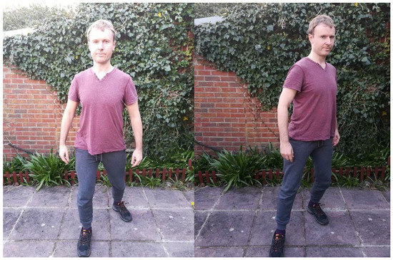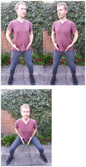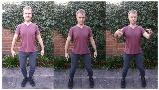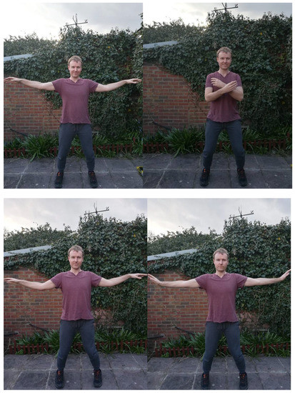Standing in specific postures is the staple exercise of many Chinese “internal” martial arts as practiced according to the Yijinjing principles and theory. In David’s class, students often hold specific stances for minutes, and this is especially the case for the opening stance seen at the top left side of Figure 4 (heels together, with the feet opened like a ballet dancer), which is regarded as a rare yet fundamental position in the School’s particular lineage, which has a South East Asian influence. As with all the other exercises explained in the previous subsections, the head is held upright from the occipital bone and crown point, the chin is tucked in, the chest is soft and relaxed, the back straightened, and the sacrum expanded with space around the armpits. George has spent extensive periods of home training, holding this and other positions during his free evenings while listening to instrumental music. He often mixes the opening stance with the neutral stance (top middle picture in Figure 4), which involves standing around in a shoulder-width position, toes slightly turned inwards so that the second toe is central, sitting into the Kua with the arms by the side. Through one’s intent, students can (from the scapula) start to turn their hands so that their palms face behind them. After an extensive period—perhaps 20 or 30 min—the feet will begin to feel an immense amount of pressure. Within class training, George has joined his fellow students in slowly limping across to get a sip of water during a brief break between exercises.