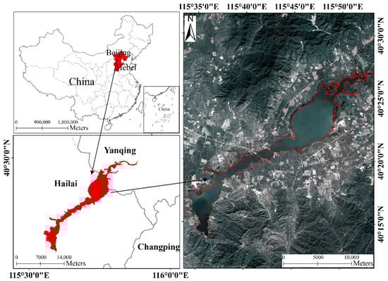 Study area in Guanting Reservoir. The location for Guanting Reservoir is in Huailai County, Zhangjiakou City, Hebei Province, China, and Yanqing County, Beijing City, China. Remote sensing image (30 × 30 m/pixel) is the combination of the band 4, band 3, and band 2 of Landsat-8 in September 2019.