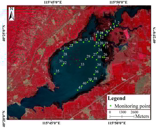 In this study, water sampling and measurements were conducted in July 2016 and 2017 and September 2019. The geographic location of the sampling vessel was located using a portable global positioning system (GPS). A Hydrolab MS5 (HACH, Loveland, CO, USA) water quality multi-function probe was used. In 2016 and 2017, sampling points were taken along the edge area of the reservoir and across the middle (Figure 2). In 2019, the sampling points were selected in ArcGIS using a fishnet, and the distribution was uniform. The essence of the instrument is to use spectral information and an empirical formula to model and measure. If the probe encounters aquatic plants or other objects underwater, it interferes with the spectrum and produces abnormal values. Abnormal values were eliminated during data processing to obtain effective monitoring points (Table 2). At each sampling point, lake water was collected in clean bottles for further analysis in the laboratory. The parameters selected for measurement included physical parameters (such as turbidity, Sechhi disc transparency, and total suspended solids) and chemical parameters (e.g., Chl-a, hydrogen ion concentration (pH), total nitrogen, total phosphorus, chemical oxygen demand, biochemical oxygen demand, and dissolved oxygen). In this study, we analyzed and evaluated the Chl-a content.