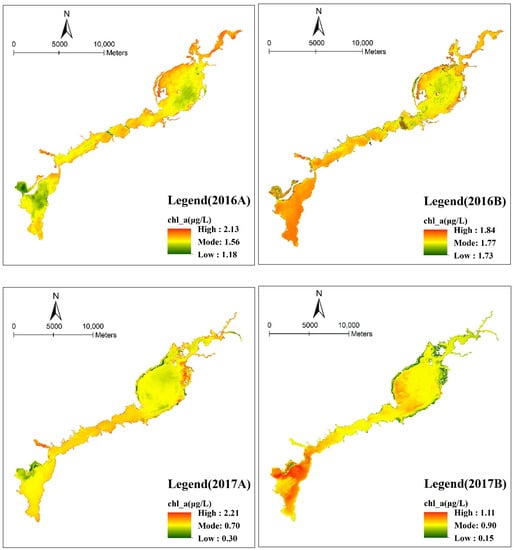 Distribution of chlorophyll-a concentrations of Landsat-8 OLI (2016A, 2017A) and Sentinel-2A (2016B, 2017B) in the Guanting Reservoir in 2016 and 2017. The color bar indicates the closeness of the concentration value to the mode. Red indicates values exceeding the mode, while green indicates values below the mode.