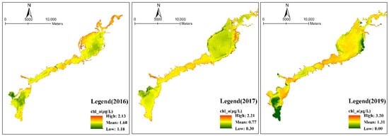 Taking the remaining points of the measured data as verification data, the retrieval accuracy of the stepwise regression model is presented in Table 5. By looking up the critical value table of the linear correlation coefficient, we can see that, when the sample number is 11, the critical value at the significance level of 0.05 is 0.602. As 0.66 is greater than 0.602, the predicted values in 2016 and 2019 are significantly correlated with the measured values at a significance level of 0.05. When the number of samples was nine, the critical value at the level of 0.05 is 0.666, so the predicted value in 2017 was significantly correlated with the measured value at the significance level of 0.05 []. Therefore, the three models can be used to retrieve the chlorophyll-a concentration at the corresponding time. The stepwise regression model can retrieve the chlorophyll-a concentration and distribution based on good correlation. Therefore, a stepwise regression model was used to simulate chlorophyll-a concentration in this study.