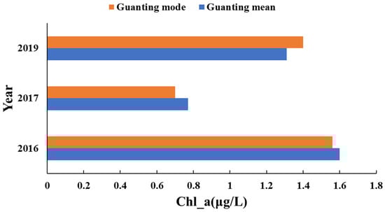 Annual mean and mode changes of chlorophyll-a concentrations in the Guanting Reservoir based on Landsat satellite images. From 2016 to 2017, the concentration of chlorophyll-a in the Guanting Reservoir decreased. In 2019, the concentration slightly increased.