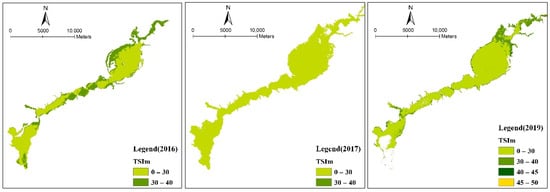 According to the nutritional status classification index provided by China’s environmental monitoring, the results show that the nutrient status of the water body in the Guanting Reservoir is gradually improving (Figure 6). The Guanting Reservoir was mesotrophic in 2016, and the reach of the Guishui River into the reservoir and most of the Guishui River reservoir area was mesotrophic. After 2016, the eutrophication status of the reservoir water improved as a whole, and it was in an oligotrophic state. Some areas on the edge of the reservoir were close to the mesotrophic state, resulting in a lack of oxygen in the mean temperature layer. In 2017, the overall trophic index of the reservoir water was below 30, indicating a state of poor nutrition, clear water, and sufficient oxygen in the mean temperature layer.